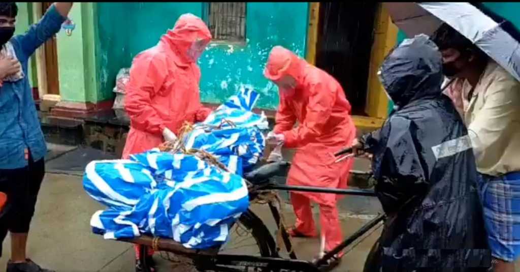Finally, the family (4) ruled to carry the body on a bicycle amidst rains & taken it to the cremation field for the past rites.
