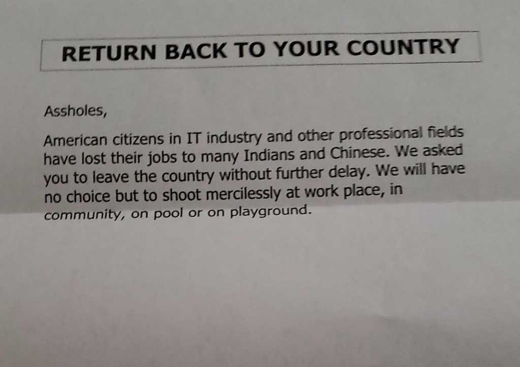 The letter reads, “American residents within the IT sector & different professional fields have lost their own jobs to numerous Indians & Chinese. We inquire you to leave the nation without furthermore delay. We’ll have no choice however to shoot mercilessly in office, in society, on pool (or) on playground.”