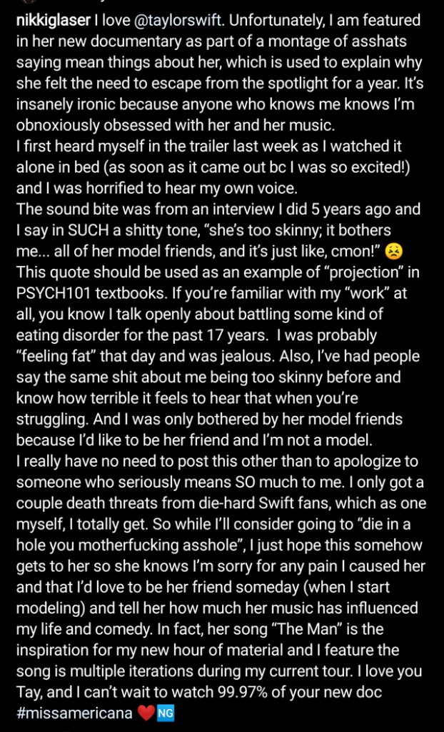 Nikki Glaser has written on Social Media, in response to what she said in Miss Americana, “I love @taylorswift.”